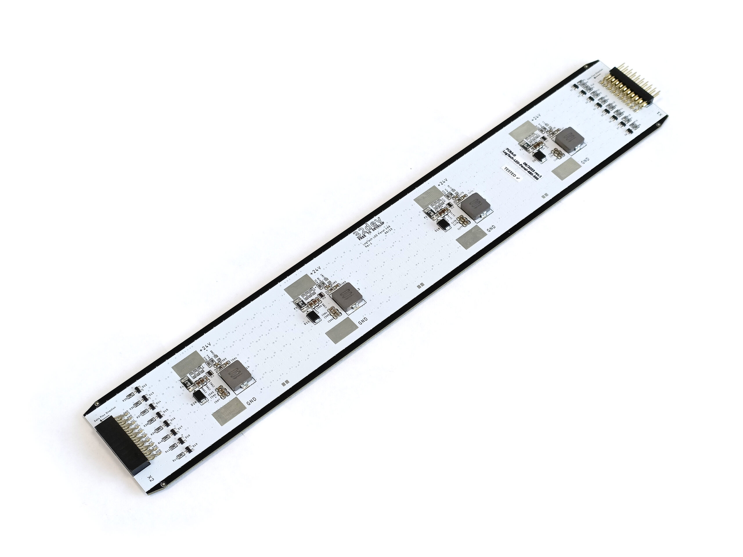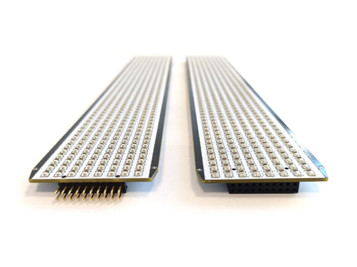 Naše řešení implementovalo rozšířené konektory, které přenáší nejen řídící data pro jednotlivé LED čipy, ale díky čtyřvrstvé měděné desce plošných spojů dokáží i bez problému napájet celou sestavu panelů. Tímto řešením jsme se zbavili nadbytečné napájecí kabeláže, kterou bylo u předchozího řešení potřeba zavést u každého individuálního panelu, což vedlo ke snížení složitosti a času potřebného k provedení instalace.